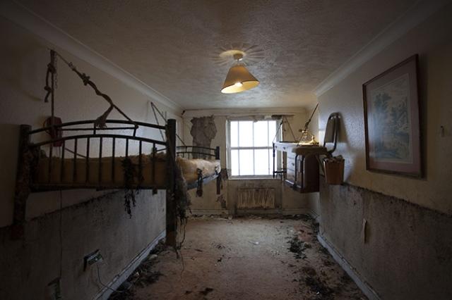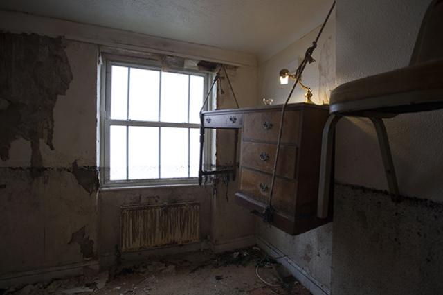 Do You Know Nothing? Do You See Nothing? Do You Remember, Nothing? (2018) is a site-specific installation created for the exhibition 'At The Violet Hour' at the Nayland Rock Hotel, Margate where artists were asked to respond to T.S. Elliot's poem 'The Wasteland'. The room responds to the dislocating sense of time in the chapter A Game Of Chess and the sense of critical exhaustion that resonates throughout the poem. Critchley considers this in relation to the current environmental situation where there is a strange conflation of future and present, as climatically things are changing so rapidly. The work takes references from the opening scene depicted in the chapter but also accentuates what was already happening in the hotel room. Critchley is interested in the psychology of our response to climate change; how environmental catastrophes are playing out around us, yet for the most part in the west we remain disengaged and indifferent. The room has become a space that floods at high tide, where the person has adjusted to a make shift way of living with this continual flooding.